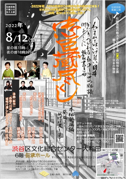 附けの會(代表:山崎徹)主催、『忠臣蔵尽くし 本伝発端編』が2022年8月12日 (金)に渋谷区立文化総合センター大和田 伝承ホール(東京都渋谷区)にて上演されます。