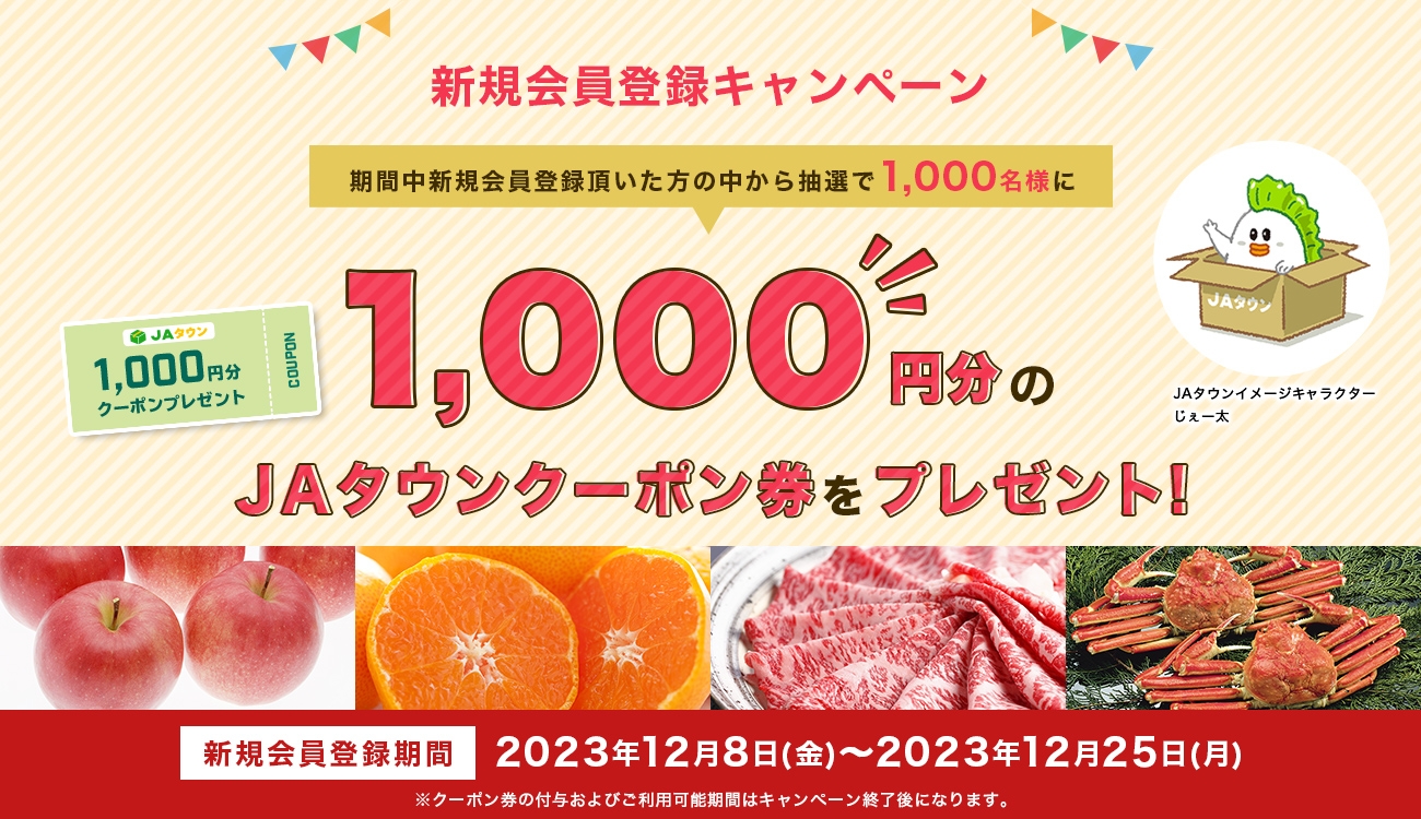 内 容:期間中、JAタウン新規会員登録頂いたお客様の中から抽選で1,000名様に1,000円