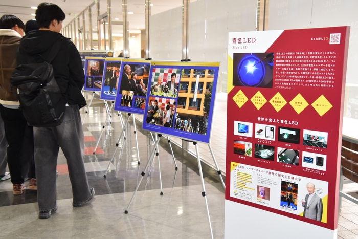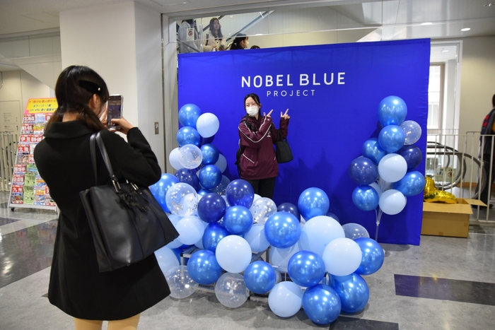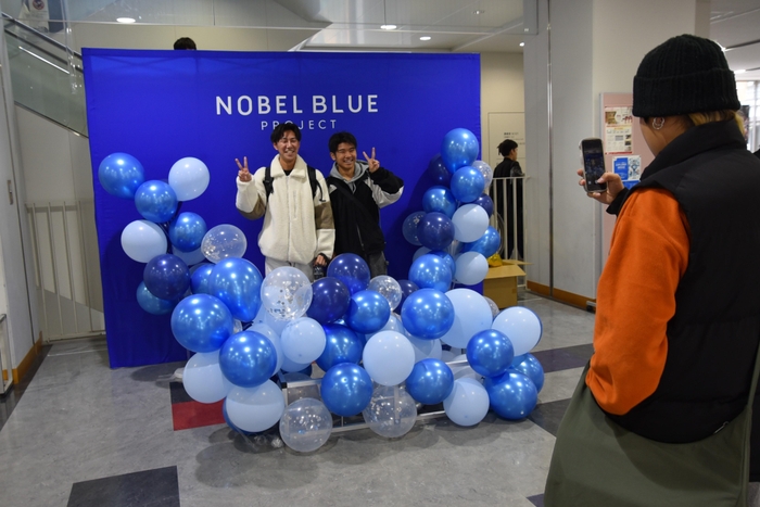 共通講義棟北の学生ホールではこのほか、2019年のノーベル化学賞の受賞から5年となる吉野彰終身教授の授賞式での写真やリチウムイオン電池の紹介パネルなどのゆかりの品の展示コーナーや、青色を背景にして画像を撮影してインスタグラムに投稿してもらう「フォトブース」も設けられ、学生のグループがお気に入りのポーズをお互いに撮り合っていました。「フォトブース」では13日にプロのカメラマンが撮影することになっています。