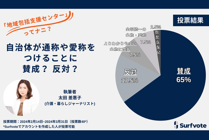 「地域包括支援センター」って何?認知を拡大するために通称や愛称をつけることに賛成か反対か、Surfvoteの意見投票では65%が「賛成」するも、「混乱を招く」と17.5%が「反対」の意見。