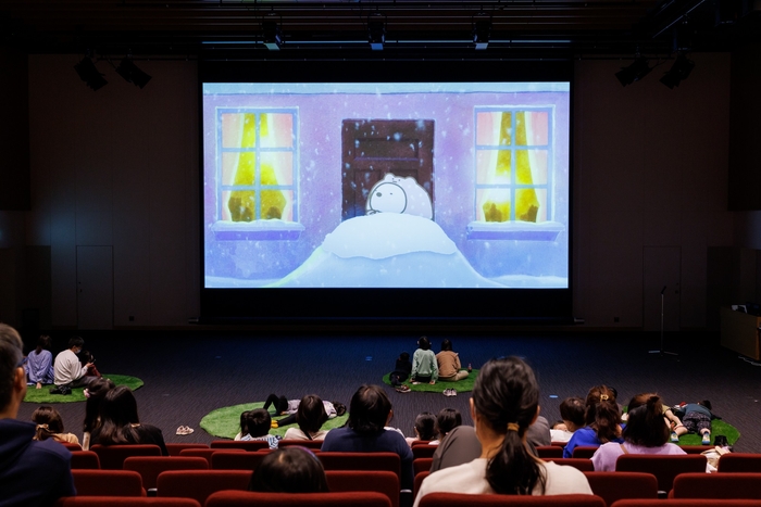 ポルトムホールでは、客席はほんのり暗い程度の照明にし、観覧席とスクリーンの間には広々としたスペースを設け、親子連れはラグの上で足を伸ばしたり寝転んだりしながらリラックスした空間となっています。映画館がはじめてのお子さま連れでも不安なく鑑賞してもらうことが出来ます。