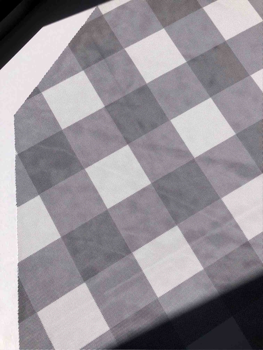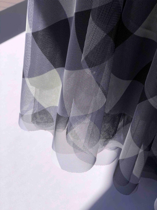 トラディショナルな印象のギンガムチェックを、ふんわりとしたチュールにプリントすることで、軽やかに表現しました。白のチュールに、黒とグレーを2回に分けてプリントする事で、立体感のあるチェック柄に仕上げました。
