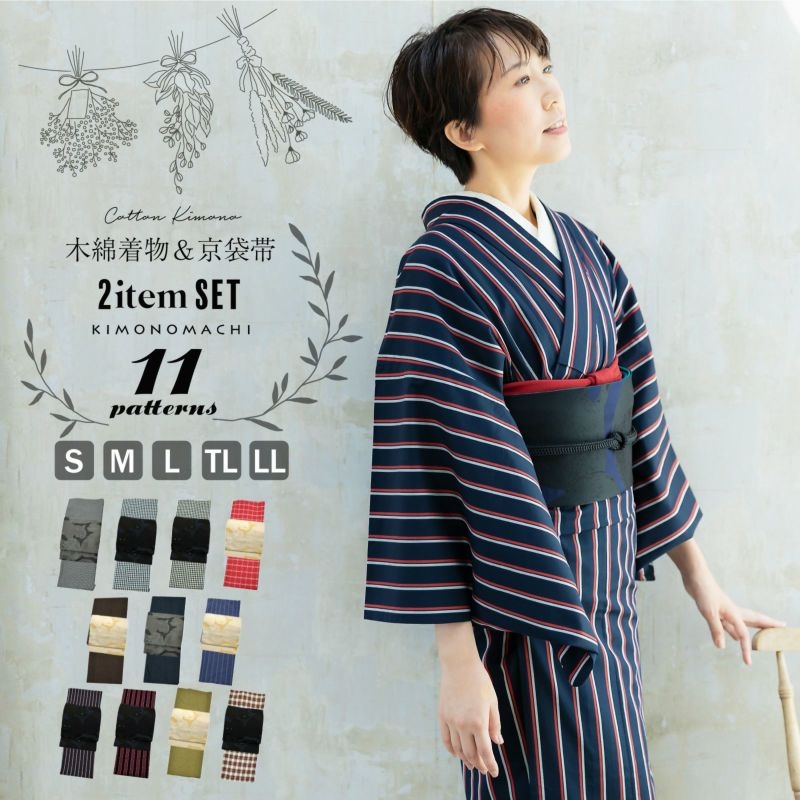 木綿着物ときもの町オリジナルの京袋帯(名古屋帯)のセットです。織りのしっかりした京袋帯が、カジュアルな木綿着物にお洒落感をプラス。ちょっとしたお出かけにもOKです。