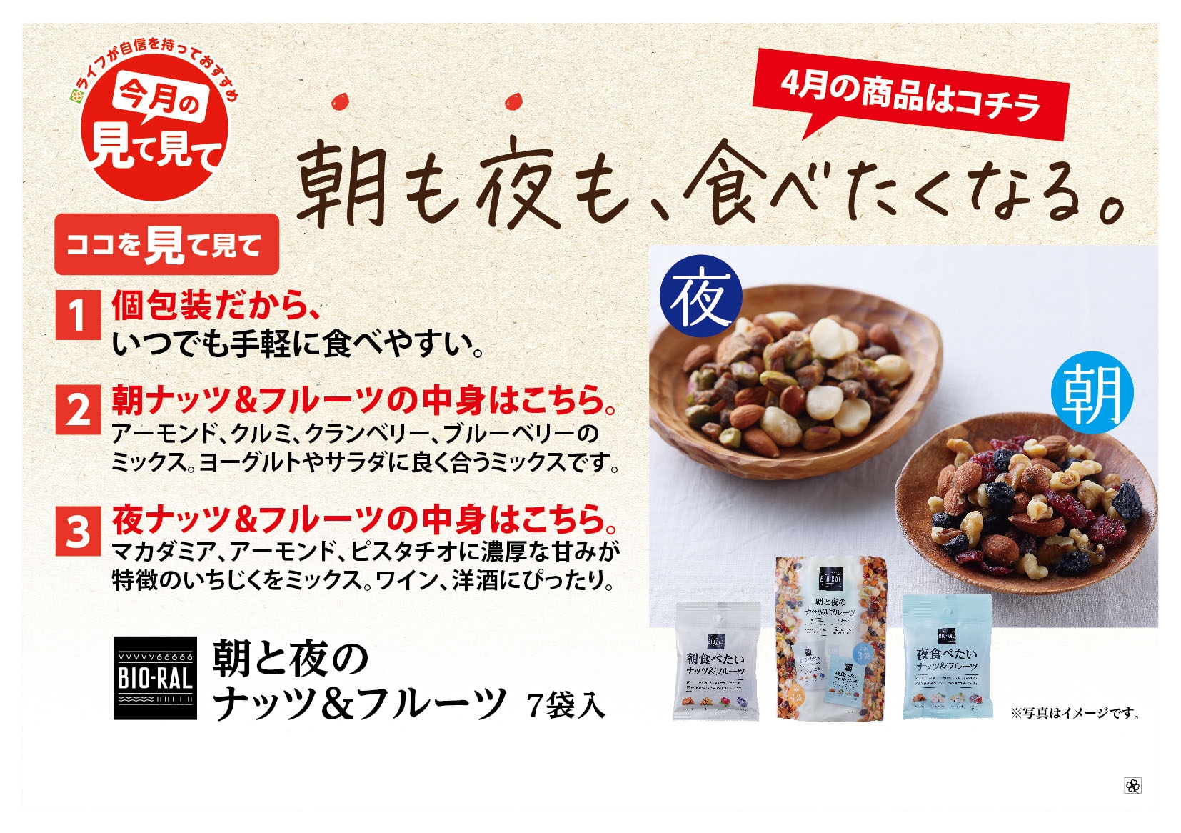 ライフが自信を持っておすすめする「今月の見て見て」の近畿圏4月商品に選ばれた「BIO-RAL 朝と夜のナッツ&フルーツ」は、朝と夜それぞれのシーンに合わせたナッツとドライフルーツが入った食べきりサイズです。”朝”には、バタバタする朝にサッと食べられるヨーグルトと相性ばっちりのクルミやベリーが入り、”夜”には、コロナ禍で増加した家飲みのおつまみにぴったりなマカダミアやピスタチオを選びました。