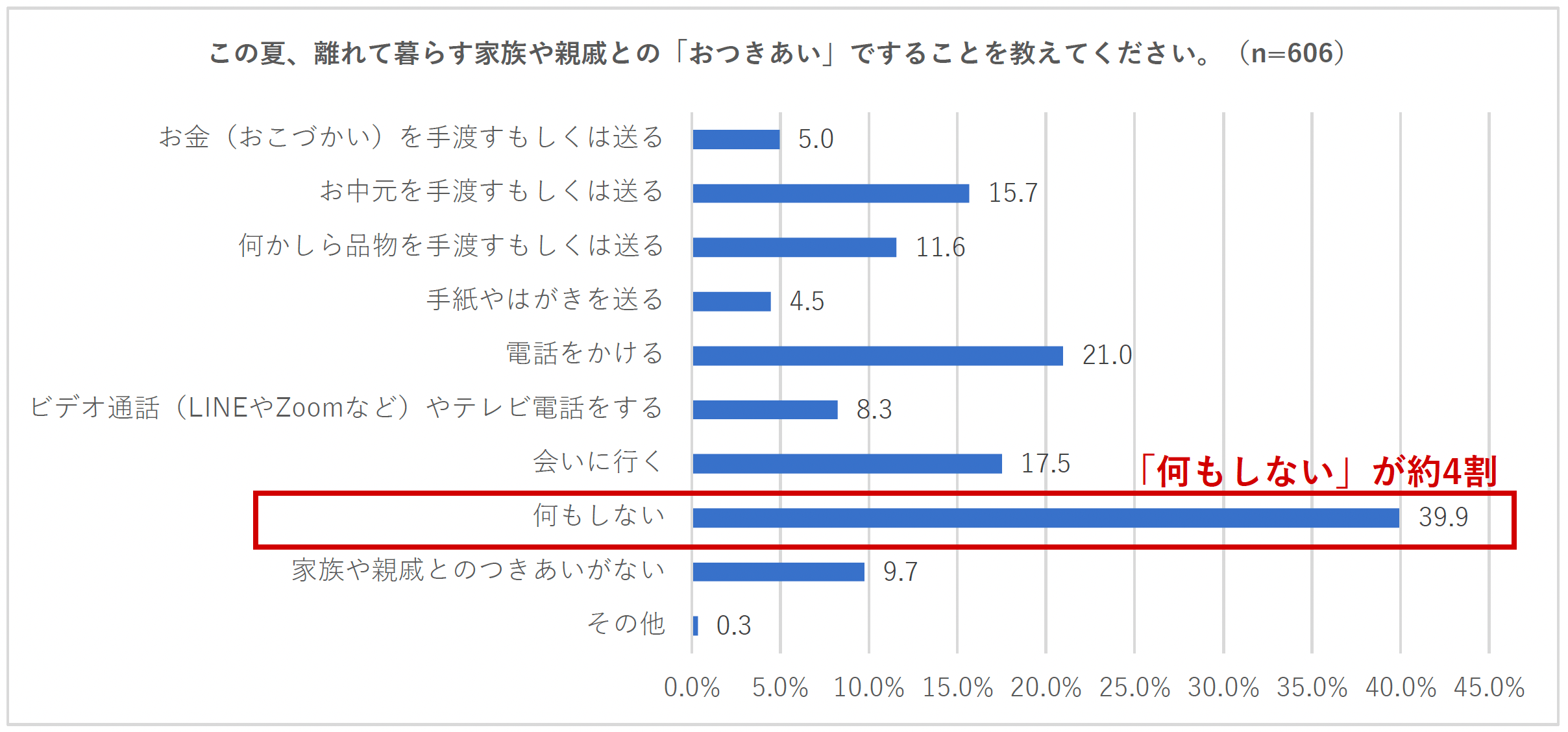 「離れて暮らす家族や親戚とのおつきあいで何をするか」の質問に対しては、最多が「何もしない」39.9%、次いで「電話をかける」21.0%、「会いに行く」17.5%だった。