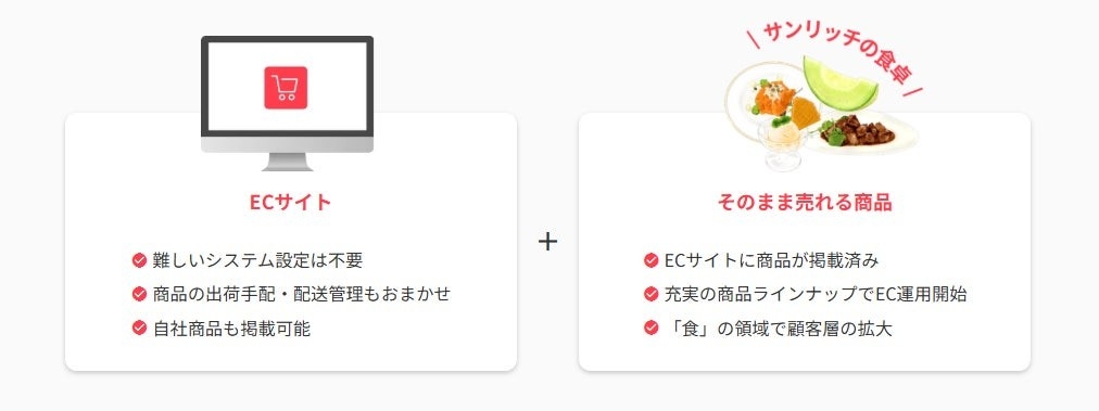 掲載商品は、グルメカタログ「サンリッチの食卓」掲載商品を中心に構成され、お客様は商品在庫を抱える必要がなくECサイトへの商品登録作業も必要ありません。また、お客様の自社商品との組み合わせ販売にも対応し、オリジナリティのあるEC展開も可能です。