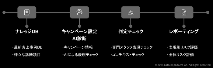 このような背景を踏まえ、ビズテーラー・パートナーズは、専門チームのノウハウと最新のAI技術を組み合わせ、より高度で多角的なリスク診断を実現する「SNS炎上クリエイティブチェックテーラー plus AI」を開発いたしました。