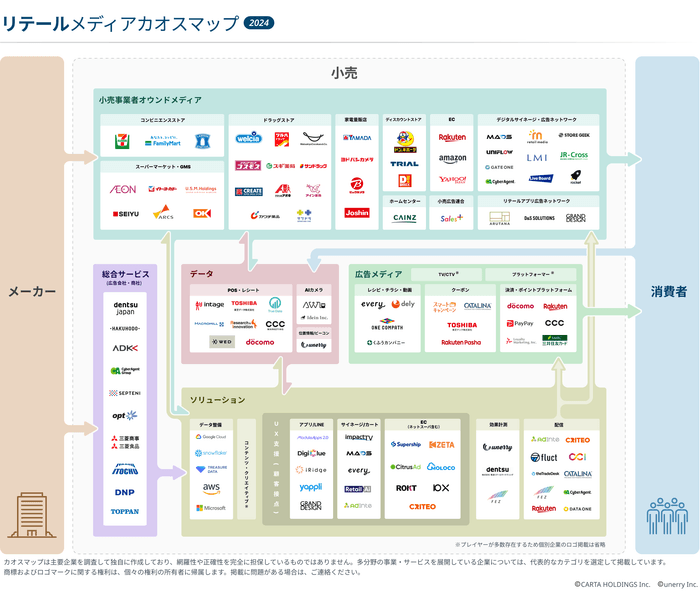 株式会社CARTA HOLDINGS(本社:東京都港区、代表取締役 社長執行役員:宇佐美 進典、以下 「CARTA HD」)と、株式会社unerry(東京都港区、代表取締役CEO:内山 英俊、以下「unerry」)は、小売/広告/アドテクノロジーの各業界最前線に従事する主要24社とプロジェクトを組成し、主要プレイヤーの洗い出しやカテゴリー検討などの業界分析を重ね、リテールメディアカオスマップ2024年版を作成しましたので公開いたします。