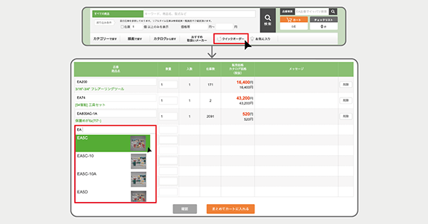 品番と数量を入力して購入したい商品をまとめてカートに入れることができるクイックオーダー機能を実装しました。これにより、商品ごとの検索の手間を省きより少ないアクションでの購入が可能となったほか、「品番 商品名」欄にサジェストを表示することで快適な購買体験を提供しています。