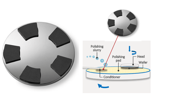 CMPパッドドレッサーは、このCMP工程で使用される研磨パッドの表面状態を再生し、パッドの平坦性および適切な粗さを維持するための専用ツールである。用途としては、パッド表面をコンディショニングし、均一な研磨性能を保つことで、CMPパッドの寿命延長、研磨の安定性向上、そしてウェーハ加工品質の確保に寄与する。統合回路の製造において、CMPパッドドレッサーはCMP工程全体の性能と効率を維持する上で欠かせない重要な役割を果たしている。