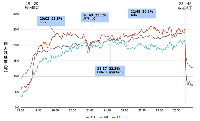 MT層は21:30周辺でピークが見られ、FT層は20:00と22:40周辺で視聴率が高くなっています。