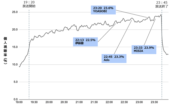 視聴率の推移をグラフで見ると、19:20の放送開始から23:45の終了まで上昇する傾向にあり、注目の歌手や特別企画の場面では高い数値を記録しています。