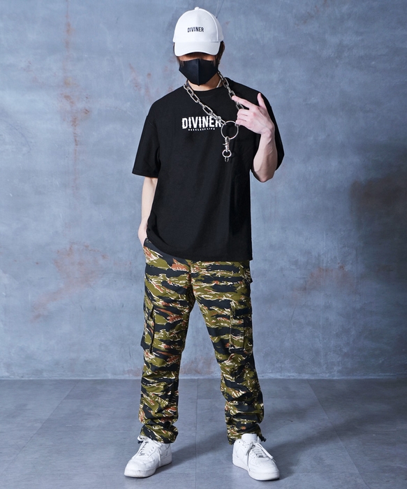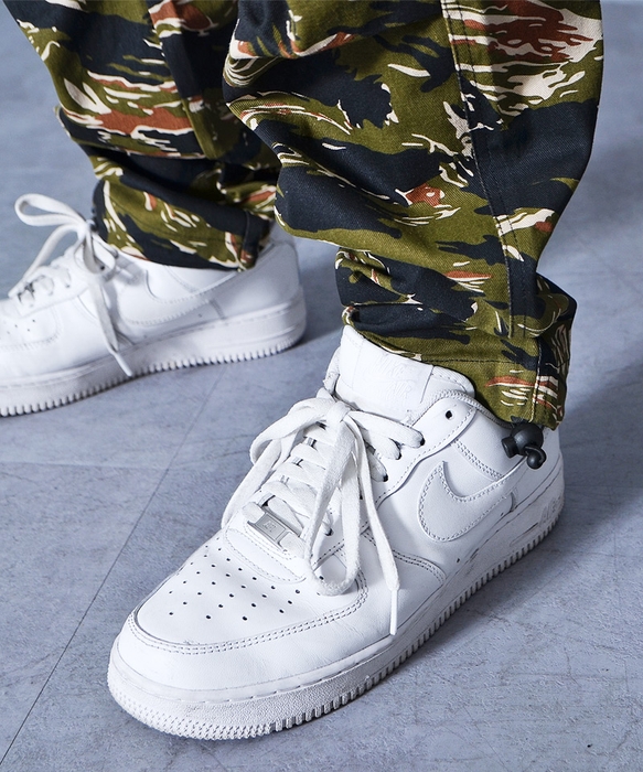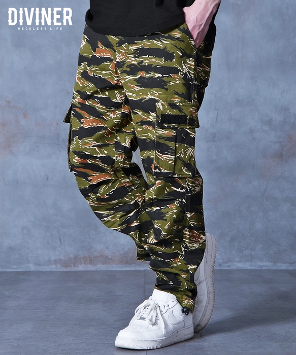 ミリタリーアイテムで重宝されるタイガーカモ柄をストリートファッションの定番、カーゴパンツに落とし込んだ多様なスタイルが楽しめる万能パンツ。
