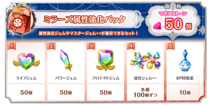 無償を含むマギアストーンで購入できる「ミラーズ属性強化パック」には以下のアイテムが封入されています。