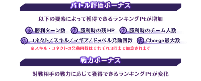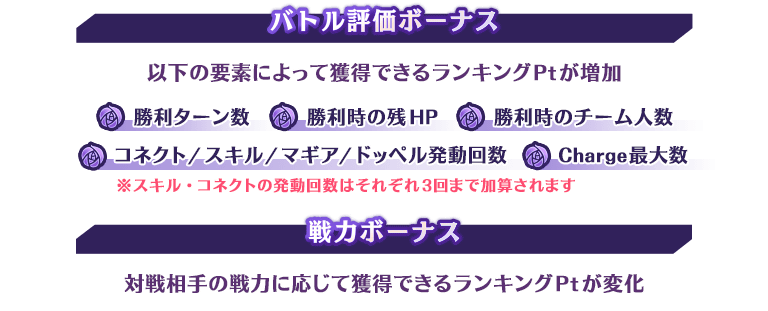 バトル中に溜めたChargeの最大数が5以上の場合、その最大数に応じてポイントが加算されます。(最大数20まで)