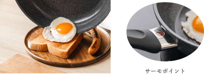 さらに、Bari(バーリ)には調理を始める適温が一目でわかる「サーモポイント」を搭載。ハンドル根元の緑色の丸が加熱することにより赤色に変わることで予熱完了をお知らせ。食材を入れるベストなタイミングが一目でわかり、調理後は緑色に戻ってから洗浄することで、急激な温度変化がなくなり、コーティングの性能を長持ちさせたい方におすすめです。
