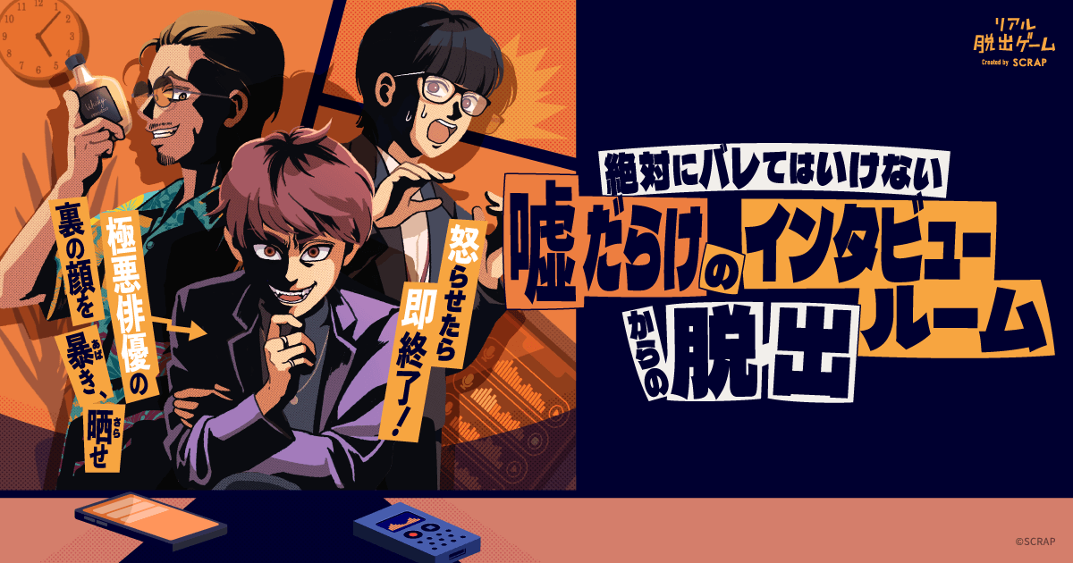 全世界で累計1,490万人以上を動員しているリアル脱出ゲームを企画制作する株式会社SCRAP(本社:東京都渋谷区、代表:加藤隆生)は、リアル脱出ゲーム『絶対にバレてはいけない噓だらけのインタビュールームからの脱出』(以下、インタビュー脱出)の愛知、京都、岡山会場の開催について詳細を発表いたします。