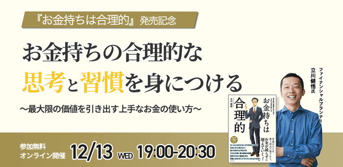 多くのお金持ちと接することでその思考&習慣を身につけたファイナンシャルプランナー立川健悟氏の新刊『お金持ちは合理的』発売記念【無料オンラインイベント】12月13日(水)19時より開催!