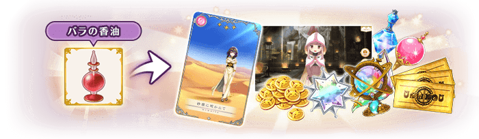 本イベントで獲得した「バラの香油」は限定メモリア「砂塵に吹かれて」や限定ホーム背景「アレクサンドリアの蜃気楼編」等、貴重なアイテムと交換できます。