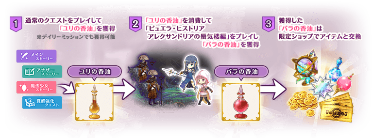 「ユリの香油」を消費すると本イベントのクエストをプレイでき、限定アイテムや覚醒素材と交換できる「バラの香油」を獲得できます。