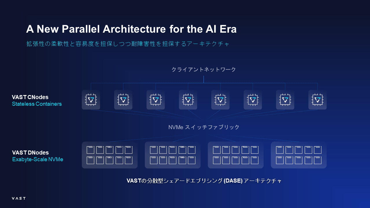 このような課題に対処するため、VAST Data Platformは、ストレージやデータベース、コンテナ化されたコンピュートエンジンサービスを拡張性のあるソフトウェアプラットフォームに統合しており、最新のデータセンターでAIやアクセラレーテッドコンピューティングツールがパワーを発揮できるように設計されています。また、VAST Data Platformの「分散型シェアードエブリシング(DASE)アーキテクチャー」上に構築され、エクサバイト規模の大容量データを瞬時に処理できるように設計されているため、高い拡張性と冗長性を実現します。さらに、NVIDIA BlueField® DPUを活用してネットワークをオフロードし、VAST Data社製のソフトウェアを実行することで、ストレージ性能とエネルギー効率を向上させます。加えて、データセンター規模のAIインフラに強力なパフォーマンスとエンタープライズ機能を提供する、Hopperアーキテクチャーに基づくNVIDIA DGX™システムを搭載したNVIDIA DGX SuperPOD™もサポートしています。