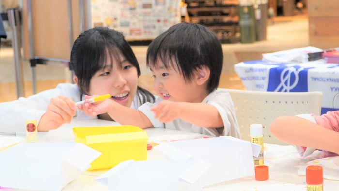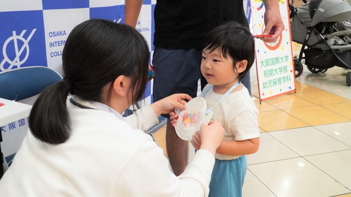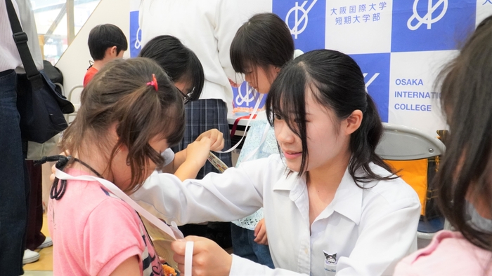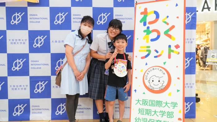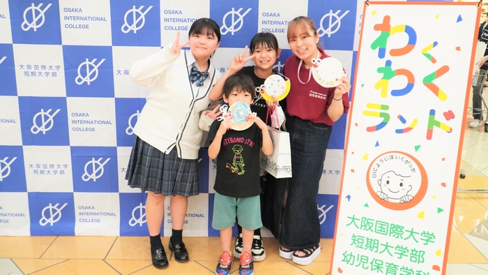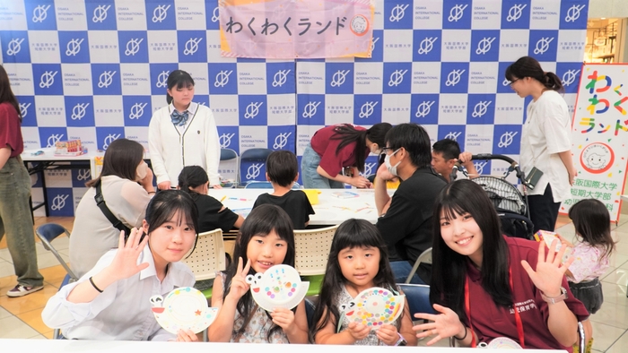 大阪国際大学短期大学部(大阪府守口市、学長 宮本郁夫)幼児保育学科では、地域連携で取り組む子育て支援活動「わくわくランド」を開催しています。この活動の趣旨は、京阪沿線で本学が唯一の保育者養成校であるため、地域と連携して、地域の若者を育て、地域の園に還すという「子育て基盤づくり」にあります。今回、大阪国際高校の幼児保育進学コース生と短期大学部幼児保育学科生で初めて合同開催しました。守口市内のイオンモール大日との連携では4回目となります。来場の親子は70組(190名)となり、多くの方々にご来場いただき大盛況でした。