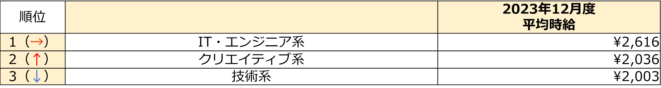 オフィスワーク系の時給は、1,629円(前年同月比+32円)。1月以降、本格的に入学試験のシーズンが開始するため、12月は試験監督の求人が多数登場しました。さらに3月の期末(人材の入れ替わり)に向けた学校事務の求人も増加。いずれも未経験から挑戦できる求人が多く、人気が高い傾向です。また、一般事務においても時給2,600円の求人が登場するなど、高時給の求人が平均時給の上昇をけん引しています。