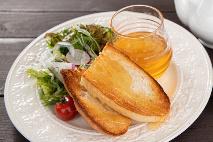 外はカリッと中はふわっとした食感が特徴のブレッドを使用し、淡路島や兵庫県内で採れたはちみつをたっぷりとかけた「ハニートースト」、トロトロのチーズと香ばしいブレッドが絶妙なバランスの「チーズトースト」をご用意。また、卵とハム、チーズ3種の相性が合うボリューム満点の「卵とハムとチーズのトースト」や、ヘルシーで栄養価の高く、卵の濃厚な味が特徴的な「オムレツプレート」をも提供いたします。