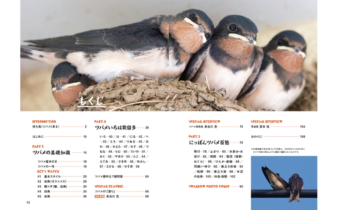 前作同様、肉眼ではとらえることの難しいツバメたちのさまざまな瞬間をとらえた美しくダイナミックなビジュアル、基本情報に加え、ツバメに関する研究論文で日本生態学会鈴木賞、日本鳥学会黒田賞を受賞、『ツバメのひみつ』『ツバメのせかい』(緑書房)なども上梓した研究者、長谷川克さんによる特別寄稿も。