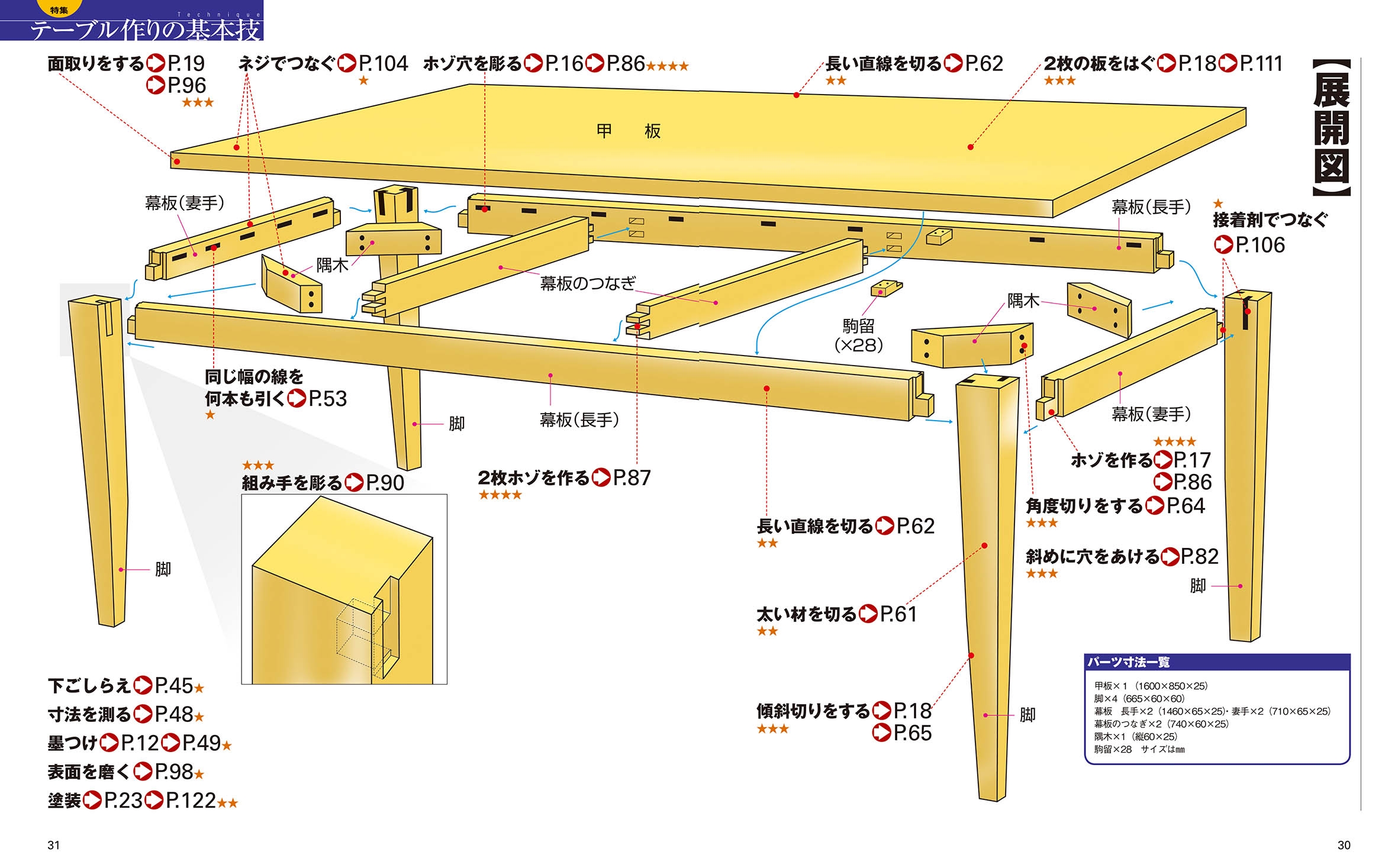 木工テープルを作成するための展開図をはじめ、組み立て手順だけでなく、木材の下ごしらえや墨つけ作業、面取り作業など、細かい作業についても詳細に紹介。