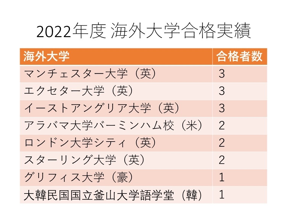 そして2022年度入試では、海外協定大学推薦制度を利用して、イギリスの大学に13名、アメリカの大学に2名合格しました。この制度以外でもオーストラリアの大学に1名、韓国の大学に1名合格しました。