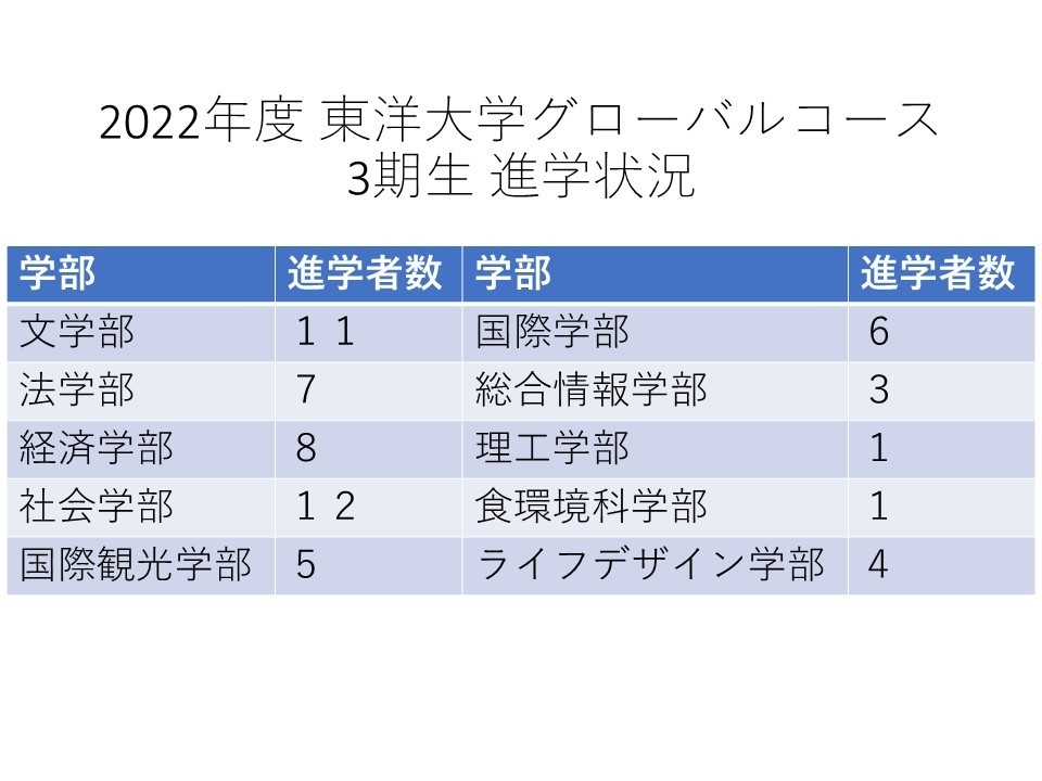 この度、「東洋大学グローバルコース」の3期生について、58名が東洋大学に合格しました。このコースに所属する生徒の70%に当たります。