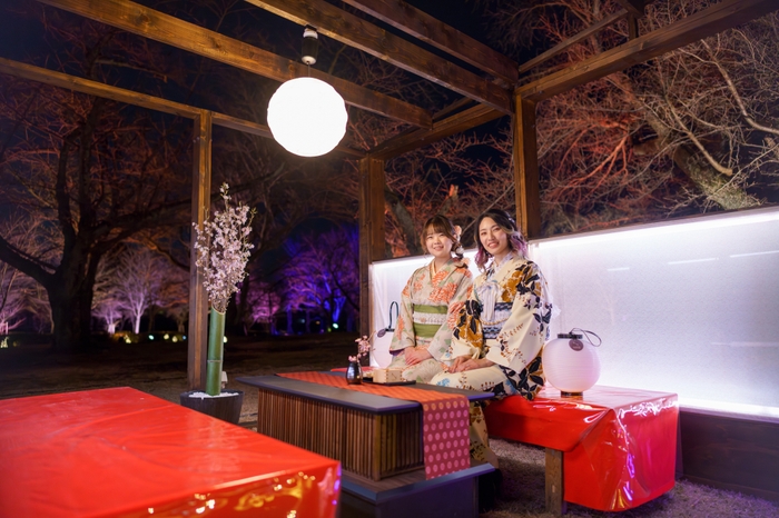城壁いっぱいに桜の宴を描いたプロジェクションマッピングが広がるお花見空間となっております。桜、抹茶など和の食材や桜色のビールなどのお酒を楽しみながら、ゆったりお花見気分を楽しむことができます。
