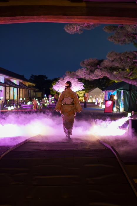 桜に囲まれた清流園に、穏やかな春風が吹くさまをイメージしたライトアップです。二条城屈指の桜並木の美しさを引き立てる音楽や香り、光に包まれ幻想的な空間が広がります。