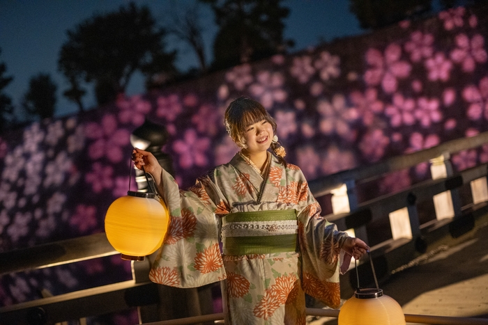 桜の花びら模様が城壁一面を彩るライトアップがなされています。ひらひらと舞う桜吹雪をイメージしたライトが足元を照らし、桜の園へと誘います。