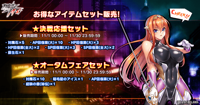 株式会社インフィニブレイン(本社:大阪市中央区、代表取締役:武山 英治)は、オンラインゲームプラットフォーム「DMM GAMES」( https://games.dmm.com/ )にて配信している、近未来くノ一ロールプレイングゲーム『対魔忍RPG』は、11月1日(火)より決戦クエストなどをお知らせいたします。