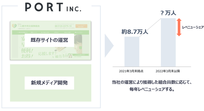 当社の強みであるインターネットメディアの運営ノウハウを活かし、一人親方労災保険組合の集客を全面的に当社が担うこととなりました。また、新規のメディア開発を通じてさらなる組合員数増加を目指していきます。現在、一人親方労災保険組合の組合員数は、毎年1万人以上純増しており、さらなる成長スピードの加速を実現していきます。また、収益に関しては、当社の運営により獲得した組合員数に応じて、毎月の収益をレベニューシェアすることで、ストック型の収益を積み上げていくことが可能となります。