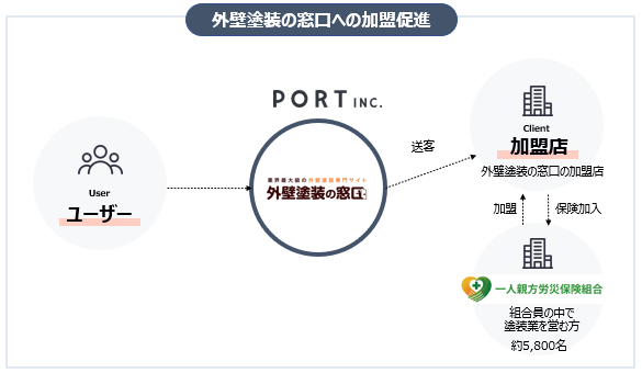 一人親方労災保険組合に加入している組合員の中で、塗装業を営む方に対して、「外壁塗装の窓口」の加盟を促進して参ります。「外壁塗装の窓口」の加盟店は、一人親方など、個人で営業されている方も非常に多くご利用いただいております。そのため、一人親方労災保険組合に登録されている、塗装業の方、約5,800人に対して、「外壁塗装の窓口」の加盟店への登録を案内し、送客先の拡大につなげていきます。また、「外壁塗装の窓口」の加盟店に対しても積極的に一人親方労災保険への加入を促進していきます。一人親方労災保険のオプションがあることで、新規の加盟店の増加にもつながると考えております。