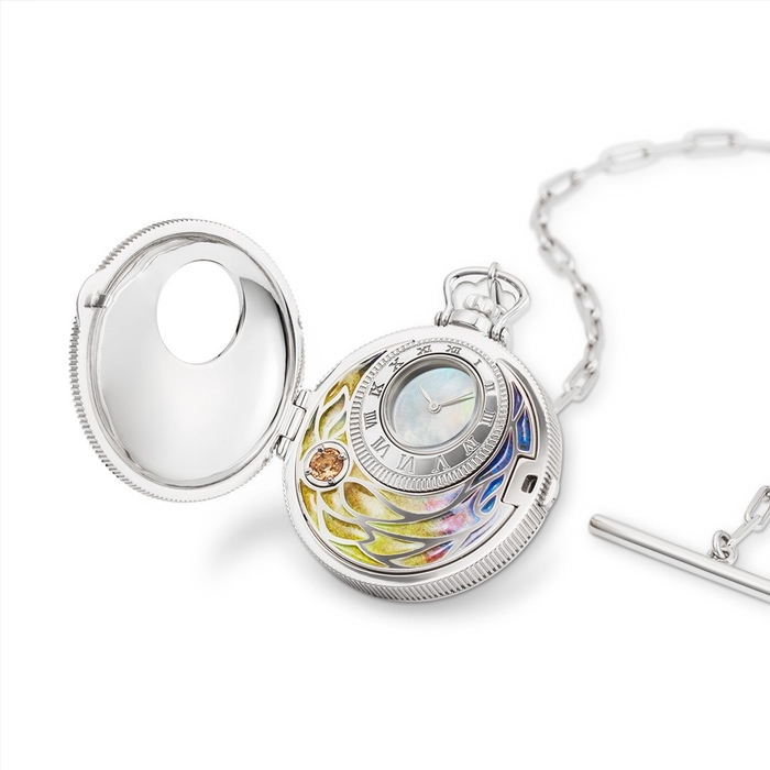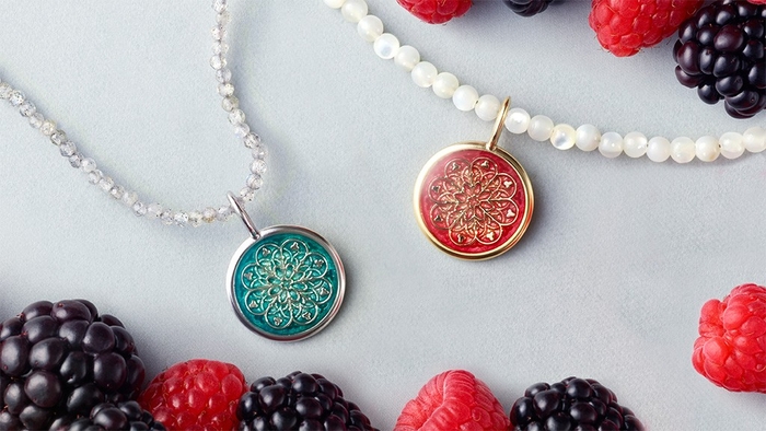 このほどの新作は、ゴシック建築などに見られる円形のステンドグラス“バラ窓”をモチーフにしたペンダントトップです。ベースとなる金属の高低差により樹脂の色味に濃淡が生まれ、美しい模様が浮かび上がります。ステンドグラスから射し込む“希望の光”に想いをこめて、大切な方への贈り物や自分へのご褒美としてもおすすめのデザインです。