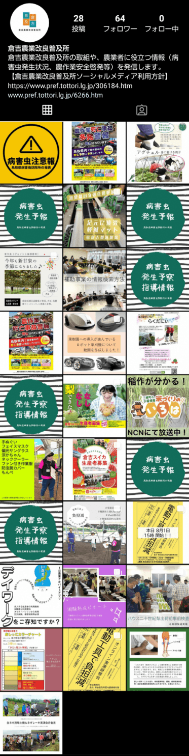 倉吉農業改良普及所(鳥取県)は、農業従事者に役立つ情報の更なる普及を図るためインスタグラム及びフェイスブックのアカウントを開設しました。普及活動や研修会開催案内などの情報を広く発信しています。