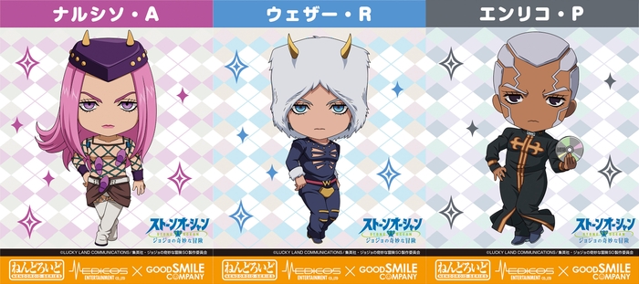 ねんどろいどシリーズからは、「空条徐倫」「空条承太郎 ストーンオーシャンVer.」「E・コステロ」「フー・F」に続き、ねんどろいど「ナルシソ・A」「ウェザー・R」「エンリコ・P」も企画開発進行中!!