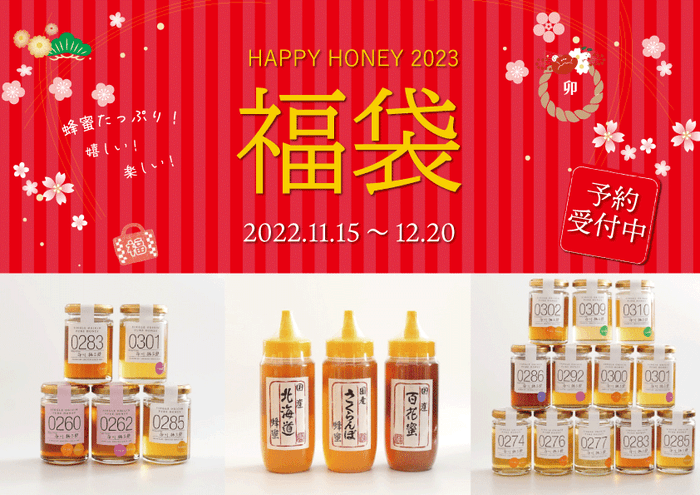 株式会社金市商店(本社:京都市中京区三条通富小路西入中之町21)は、自社が運営する「蜂蜜専門店ミールミィ」三条本店とオンラインショップにて、2022年11月15日(火)から「2023新春はちみつ福袋」の予約販売を開始いたします。