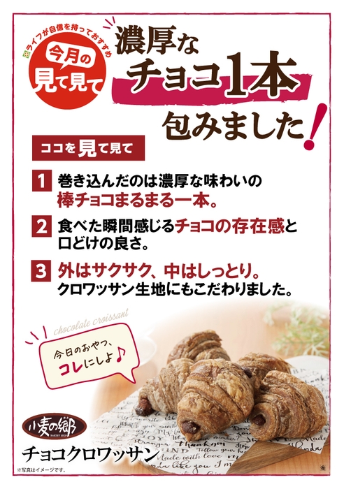 “おいしい” “ワクワク” “ハッピー” をお届けするライフコーポレーションは、手作りパンコーナー“小麦の郷”より、 「チョコクロワッサン」を1月29日に新発売いたしました。
