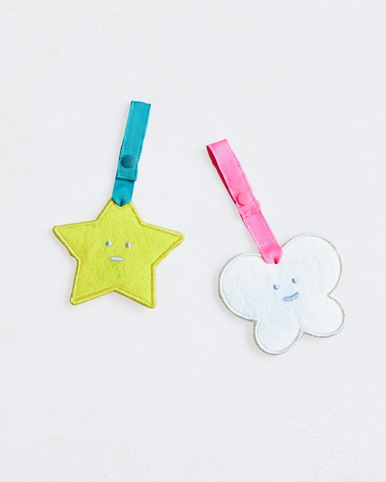 バッグの中に入れるもののイラストがはいったネームタグがバッグの脇部分に付いています。親子で楽しんでいただきたいという願いから、いとい ゆきさんが監修した星柄と花柄の2パターンをご用意いたしました。