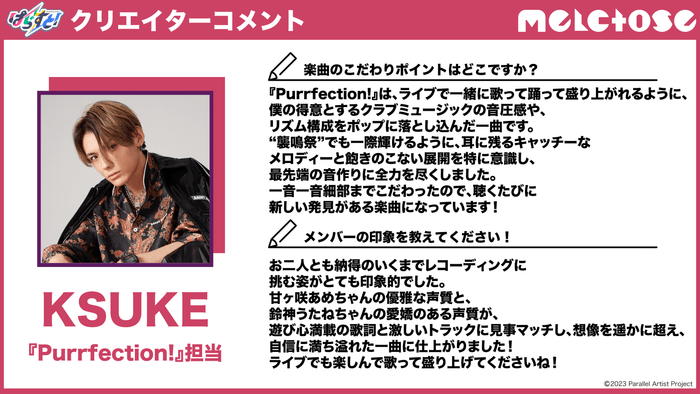 株式会社ClaN Entertainment(本社:東京都港区、代表取締役社長:大井 基行、以下ClaN)は、リアルとバーチャルでパラレルに活動するVTuberプロジェクト「ぱらすと!」から、オリジナル楽曲第2弾「Dance Crazy Night」(Signite)、「Incompletion」(Sunglows)、「Purrfection!」(melctose)のリリースをお知らせします。