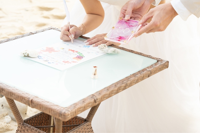 カップルの結婚を誓い合った証として発行される結婚証明書は、海の生き物をモチーフに作品を手掛ける座間味在住のイラストレーター大江ゆいさんがデザイン。ドレスは、風化造礁サンゴ*を使用した沖縄発のドレスブランド「YOKANG(ヨーカン)」と提携、ビデオグラファーにも地元で活躍するクリエイターを起用し、料理には地元の食材を使用するなど、地元資源の活用・雇用創出に繋げています。また将来的にローカルスタッフだけで運営していくことを目指した技術支援まで行っています。