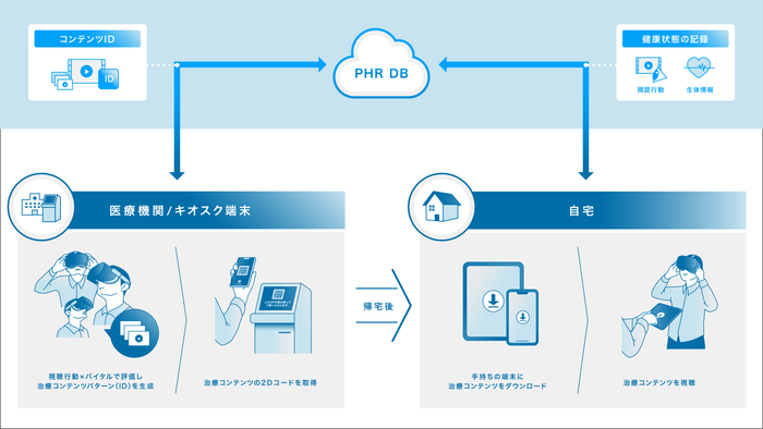 コンテンツ画像の視聴行動や視聴時の生体情報から健康状態を評価し、治療やリハビリのためのコンテンツパターンを生成してID情報を2D画像コード化して表示します。これを別の端末で2D画像認識することによりコンテンツ情報を簡単かつ正確に取得することで、いつでもどこでも視聴体験することを可能にします。
