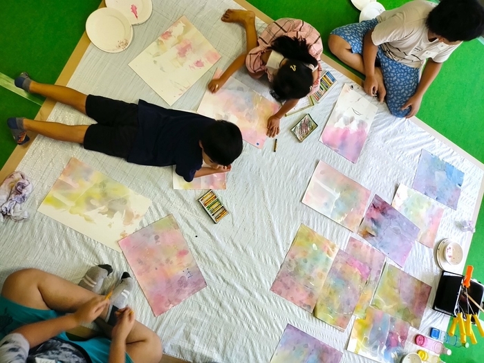 公園内にあるいろんな秋の恵みを見て、さわって、感じて、アートしよう!アートワークセラピストと一緒に絵の具やクレヨンを使って、大きな紙に秋の恵みをダイナミックに表現します。参加者みんなで一つの作品を制作し、最後はわっ!と驚く自分だけの アートも出来上がりお持ち帰りできます。