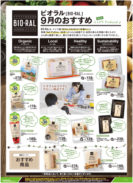 “おいしい” “ワクワク” “ハッピー” をお届けするライフコーポレーションは、健康志向のお客様におすすめしたいBIO-RAL(ビオラル)商品を、毎月お試し価格にて販売いたします。9月のおすすめは「やさしいさくら色のたまご」「化学調味料不使用 金ごま昆布・しそ昆布」「無線せきベーコンブロック」などを含む12品です。