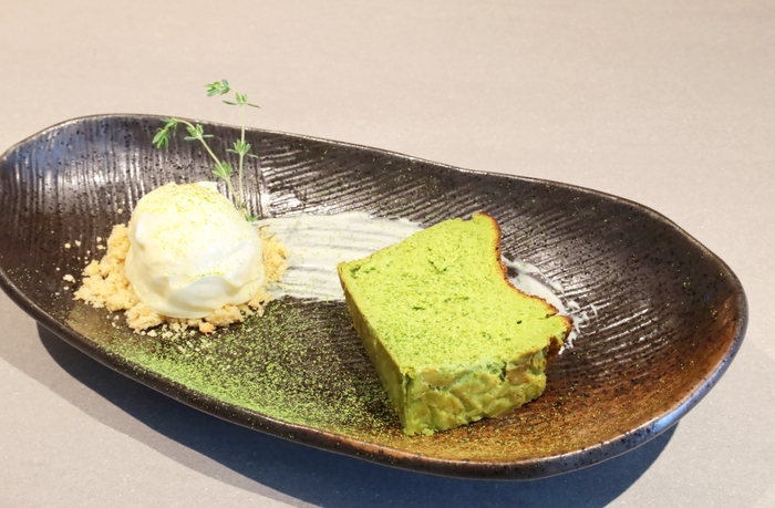 抹茶の芳醇な風味とクリーミーなチーズケーキ、さらに冷たいバニラアイスを添えて、贅沢なスイーツタイムを。